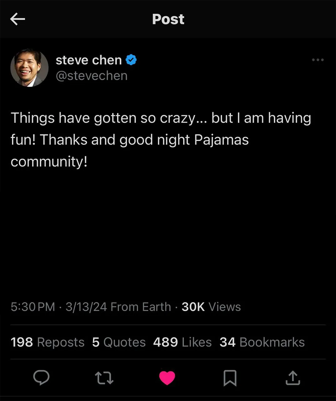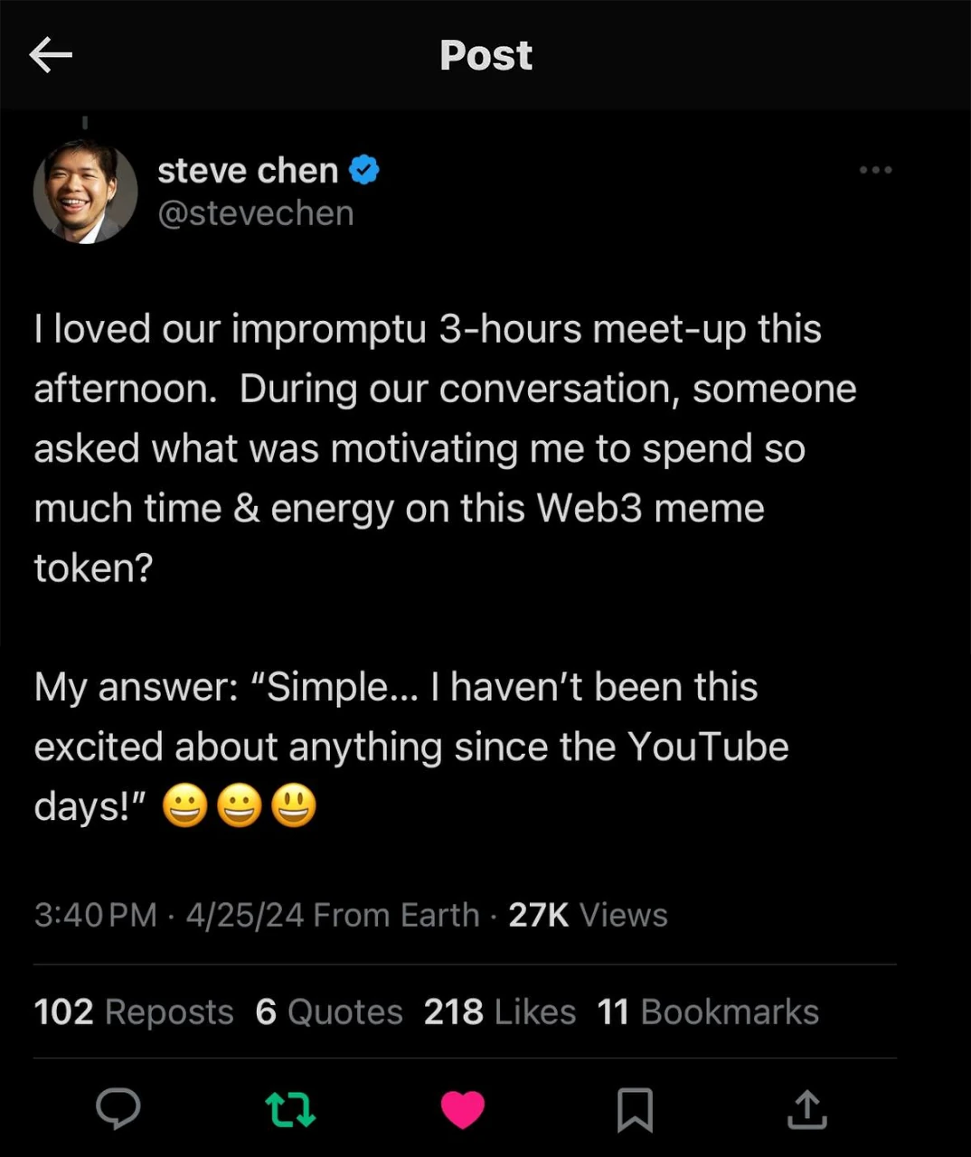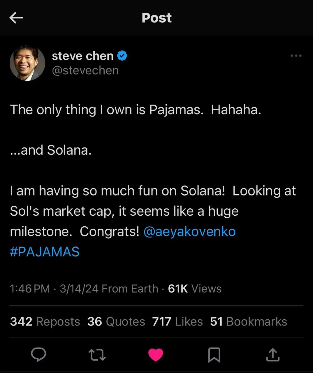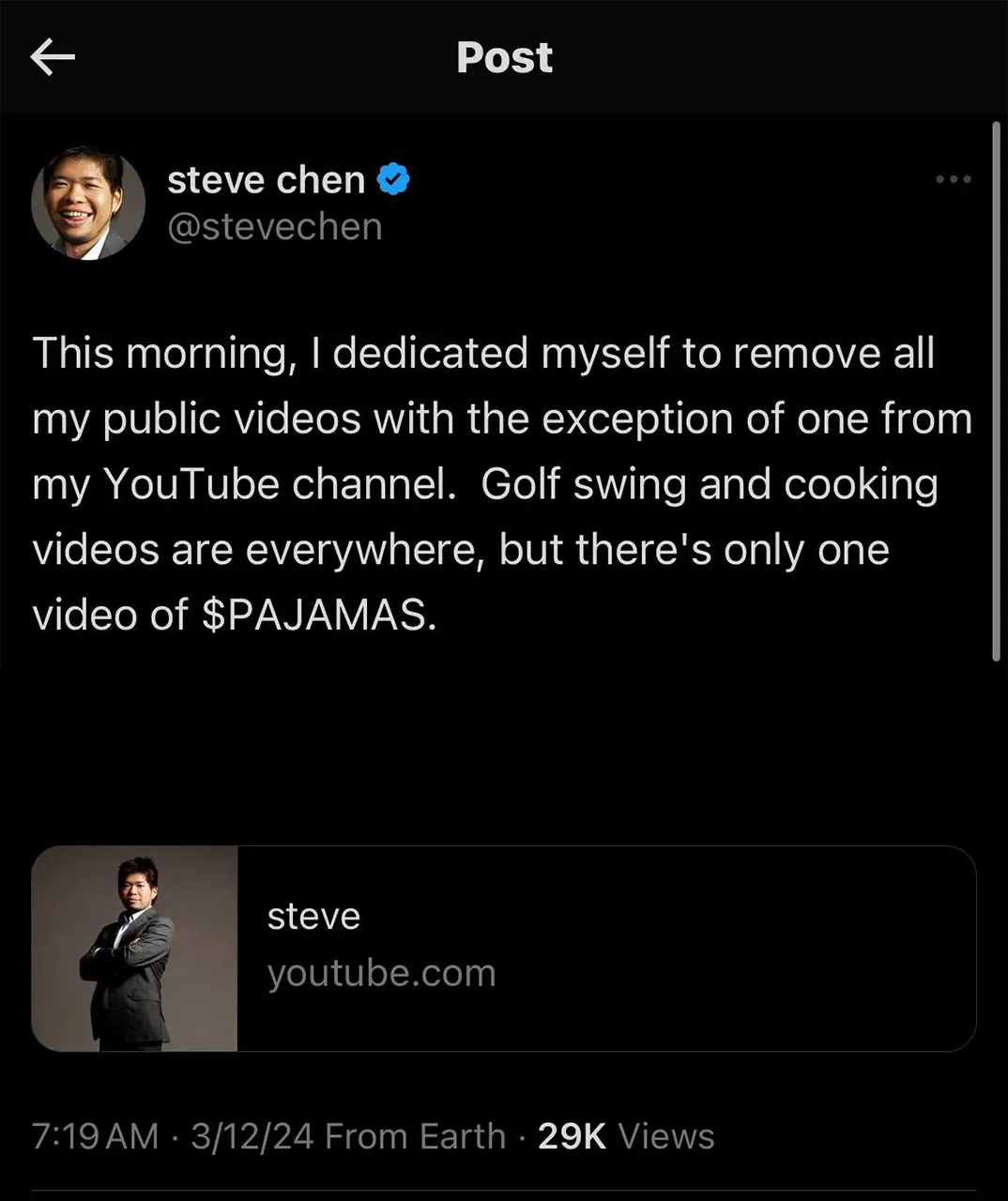 Upon noticing our efforts to immortalize $PAJAMAS and its debut in internet history, Steve Chen has showed the project his support.